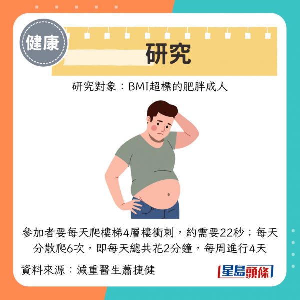 減重醫生蕭捷健在個人Facebook專頁表示,現代人的生活模式幾乎都是「久坐不動」。近年盛行「運動零食」概念則提倡將運動量「碎片化」、「零食化」,在短時間內進行高強度的活動,以取代長時間的運動鍛鍊。蕭醫生引述一項研究指,研究對象為BMI超標的肥胖成人,要求他們利用「碎片時間」爬樓梯: