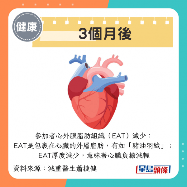 - 心外膜脂肪組織(EAT)減少:EAT是包裹在心臟的外層脂肪,有如一件「豬油羽絨」;EAT厚度減少,意味著心臟負擔減輕。