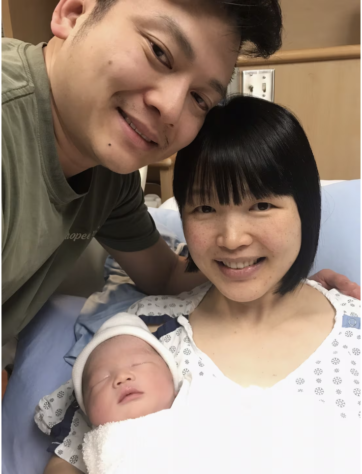 照片中兩人抱著新生兒。