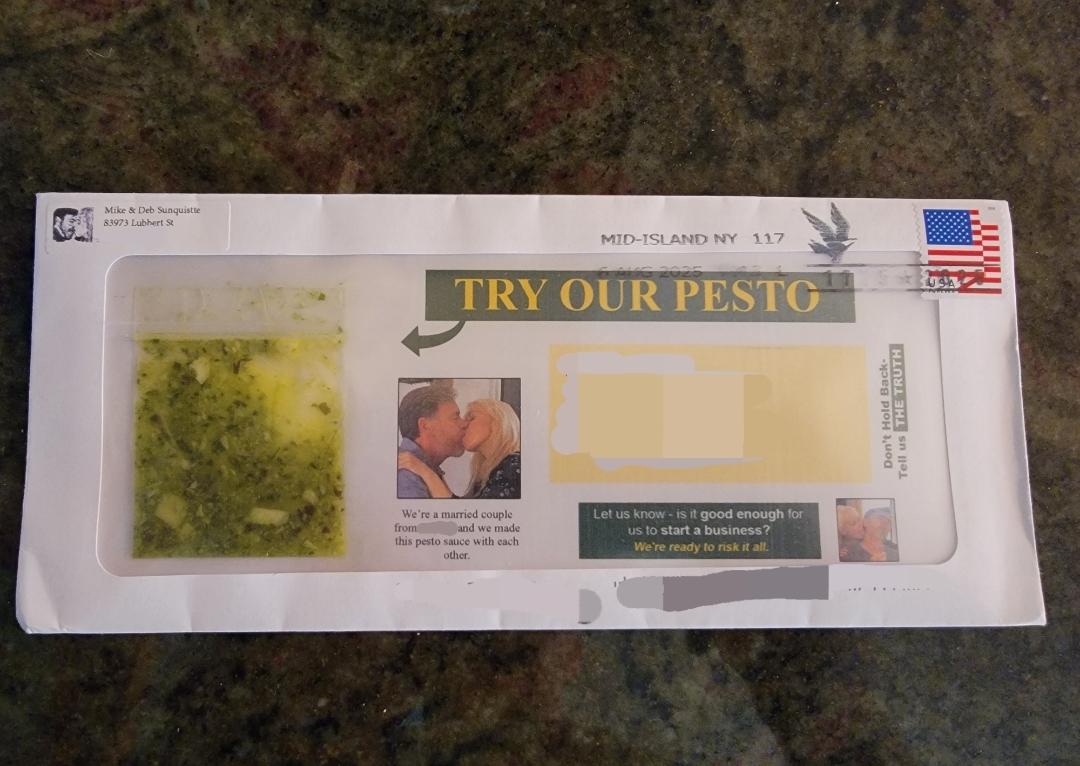 這個信封正面透明,裡面裝著一小包香蒜醬,還有幾張奇怪的照片,其中一張是一對情侶接吻,配文是:「我們是來自城市的一對已婚夫婦,我們一起做了這道香蒜醬。」