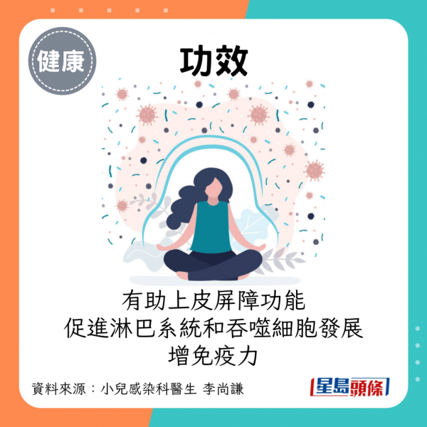 - 功效:有助上皮屏障功能,促進淋巴系統和吞噬細胞發展,增強免疫力,有助抗發炎。