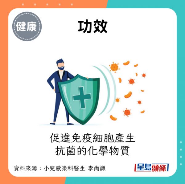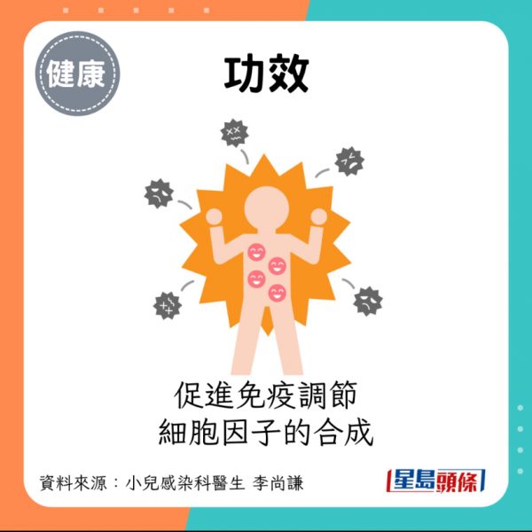 - 功效:促進免疫調節細胞因子的合成;促進免疫細胞產生抗菌的化學物質。
