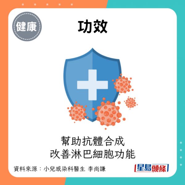 - 功效:有助抗體合成,改善淋巴細胞功能。
