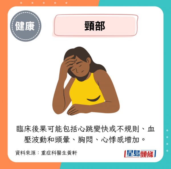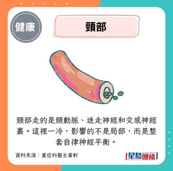 頸部是頸動脈、迷走神經和交感神經叢的重要通道。頸部一冷,影響的不是局部,而是整套自律神經平衡。臨床後果可能包括心跳變快或不規則、血壓波動和頭暈、胸悶、心悸增加。