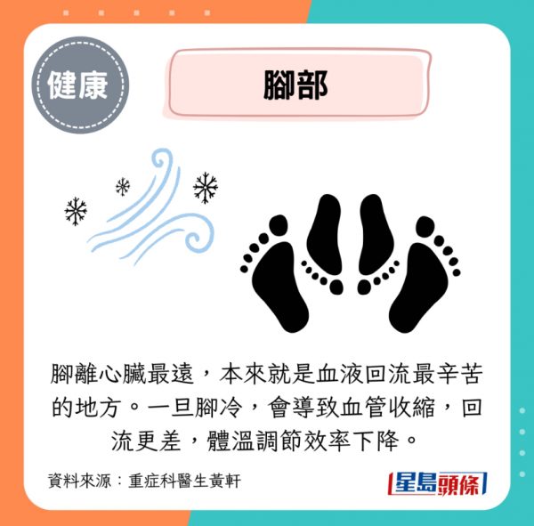 黃軒醫生指,人體不是只靠皮膚感受溫度,還靠大腦、自律神經和血流回饋來判斷身體冷或不冷。他說,以下3個部位會決定體感溫度: