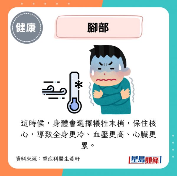 黃軒醫生說,頭部血流量高,亦靠近腦部溫控中樞。當頭部降溫,大腦會誤以為核心體溫正在下滑,導致全身血管立刻收縮、血壓上升,心臟被迫更用力工作;這也是冬天清晨特別容易出現中風與心肌梗塞的原因。