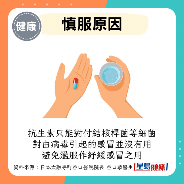 不少人患上感冒時,也會要求醫生處方抗生素。不過,日本太融寺町谷口醫院院長谷口恭醫生強調,抗生素只能對付結核桿菌等細菌,對感冒這種由病毒感染的疾病沒用,只有出現40°C或以上高燒,伴隨因細菌感染導致的肺炎等症狀時才考慮使用。他坦言,在其20年的臨床行醫經驗中,只處方過3次抗生素。