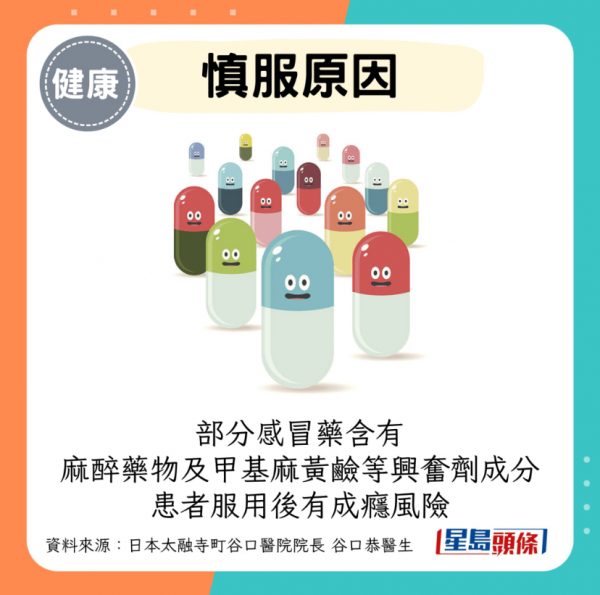 感冒藥作為非處方藥物在市面十分常見,不過谷口恭醫生指出,服用感冒藥其實有不少風險,連醫生生病時也未必會服用。因為部分感冒藥含有麻醉藥物及甲基麻黃鹼等興奮劑原料成分,雖然含量非常微小,但患者服用後仍有成癮風險。