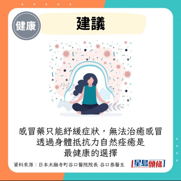 而且,感冒藥一般只能紓緩症狀,無法真正治療感冒,因此透過身體抵抗力讓感冒自然痊癒會是最健康的選擇。