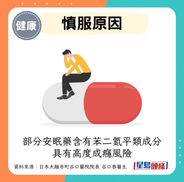 安眠藥與感冒藥類似,也具有成癮風險。谷口恭醫生指,部分安眠藥含有的苯二氮平類(Benzodiazepine)成分,具有高度成癮風險,如過量服用恐令服用者對安眠藥產生長期依賴。