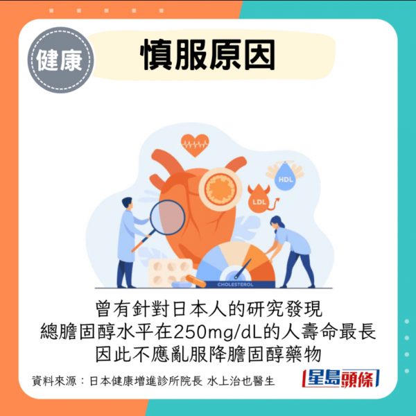 日本健康増進診所院長水上治也醫生也指出,一項分析日本人數據的研究發現,總膽固醇水平在250mg/dL的人壽命最長,因此建議不應亂服降膽固醇藥物。