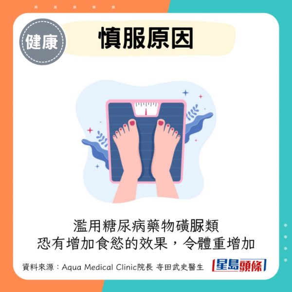 不少糖尿病患者也需服藥控制病情,不過寺田武史醫生提醒,切勿濫用糖尿病藥物磺脲類 (Sulphonylureas)。因為這種藥物本身可刺激胰臟分泌胰島素,以降低血糖。若過份濫用,恐有增加食慾的效果,如沒有控制食量會令體重增加。此外,胰島素亦會過量分泌,增加胰臟負擔。