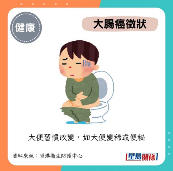據香港癌症資料統計中心資料顯示,大腸癌是香港第3大常見癌症,同時亦是香港第2大致命癌症,按最新公布數據顯示一年錄得5190宗大腸癌新症及2270宗死亡個案。根據香港癌症網上資源中心資料,早期的大腸癌有機會完全無症狀。如有徵兆,身體則可能出現以下變化: