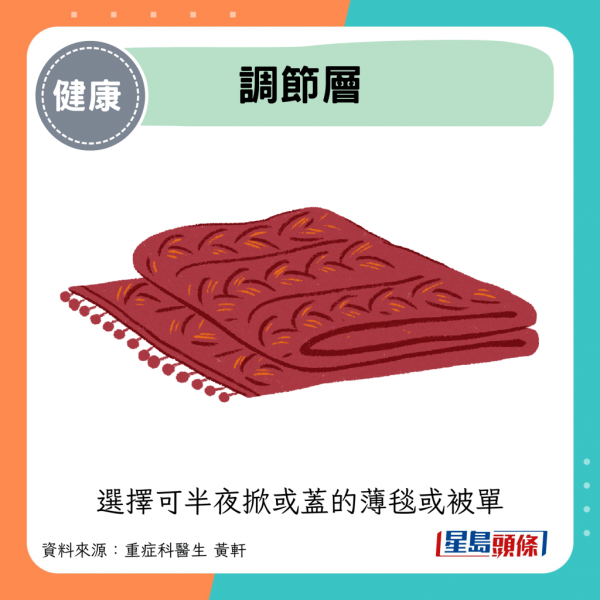 - 調節層:選擇可半夜掀或蓋的薄毯或被單