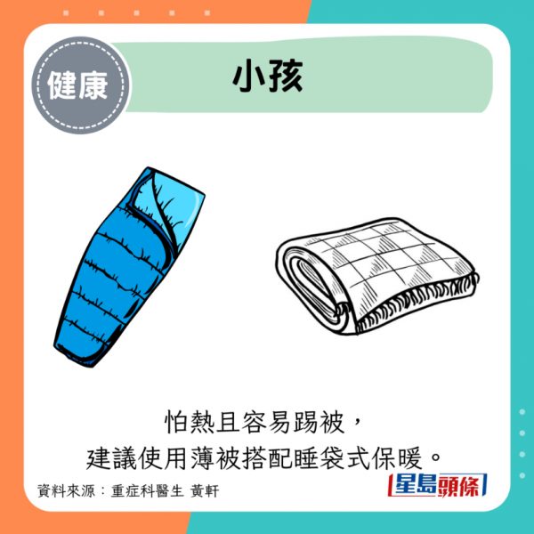 - 小孩:怕熱且容易踢被,建議使用薄被搭配睡袋式保暖。