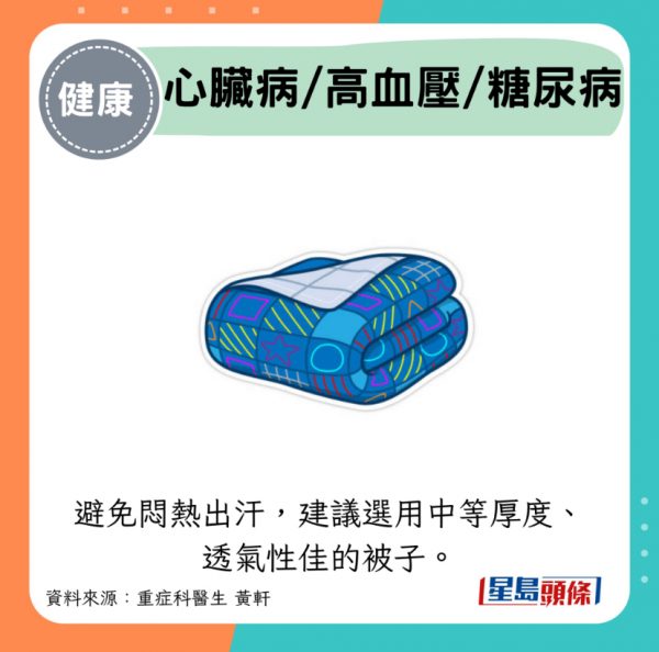 - 心臟病/高血壓/糖尿病患者:避免悶熱出汗,建議選用中等厚度、透氣性佳的被子。