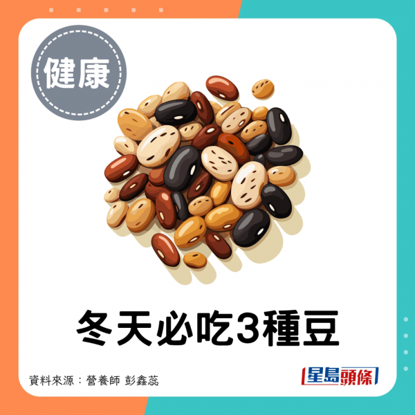 除了多種營養素,她表示,若想更好控制體重,豆類因為飽足感強,整體熱量相對較低,相對適合在冬季進食補充能量,還不會導致過多的脂肪堆積,是一個很好的食物選擇。她推介以下3種豆類,當中含多種營養與功效,建議冬天可多吃: