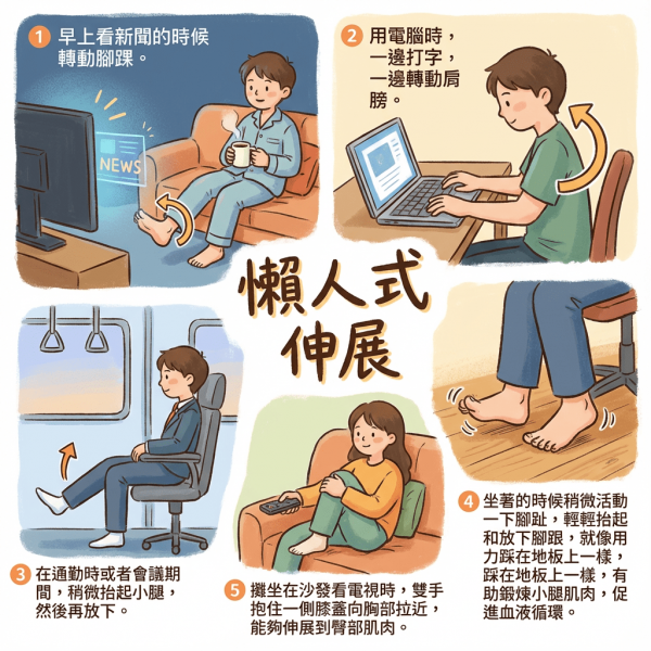 他表示,懶人式伸展有許多好處。它可以隨時隨地開始,也可以一邊看電視或用手機,一邊進行,而且大多數動作只需坐著就能完成。最重要的是它不必追求結果,不會說要做到5分鐘才合格。