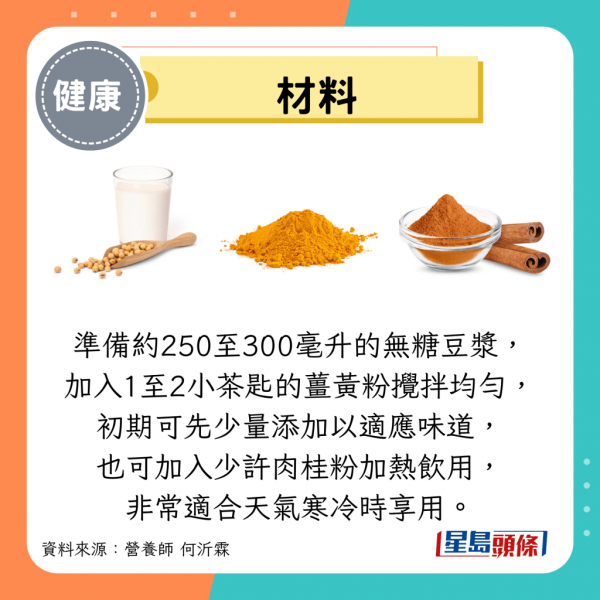 準備約250至300毫升的無糖豆漿,加入1至2小茶匙的薑黃粉攪拌均勻,初期可先少量添加以適應味道,也可加入少許肉桂粉加熱飲用,非常適合天氣寒冷時享用。