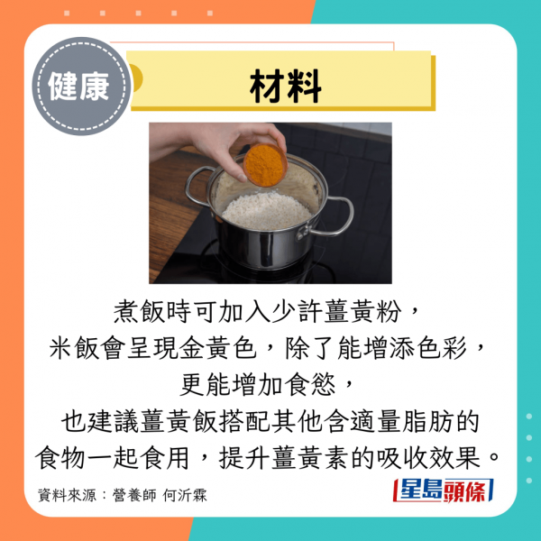 煮飯時可加入少許薑黃粉,米飯會呈現金黃色,除了能增添色彩,更能增加食慾,也建議薑黃飯搭配其他含適量脂肪的食物一起食用,提升薑黃素的吸收效果。