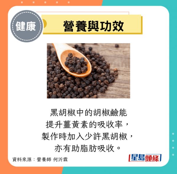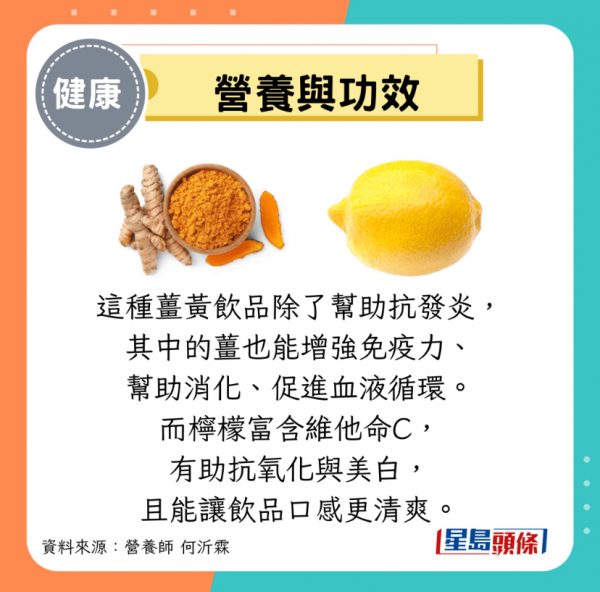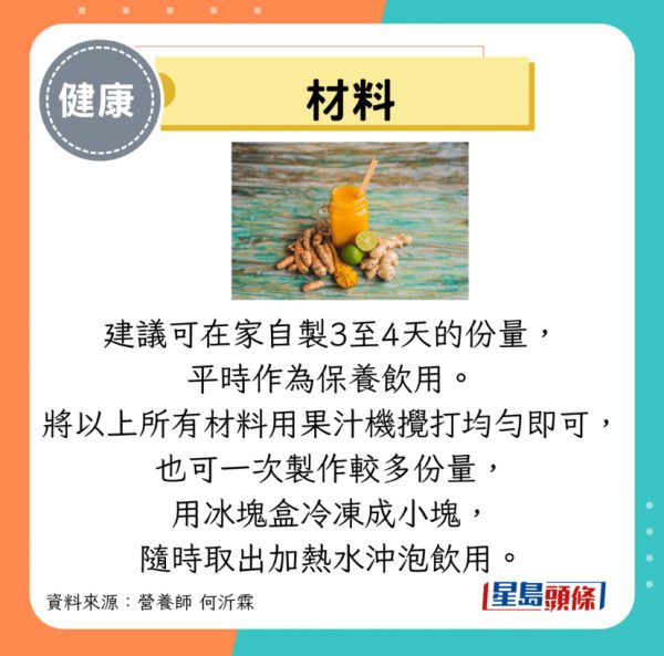 她表示,將所有材料用果汁機攪打均勻即可,也可一次製作較多份量,用冰塊盒冷凍成小塊,隨時取出加熱水沖泡飲用。這種薑黃飲品除了幫助抗發炎,其中的薑也能增強免疫力、幫助消化、促進血液循環;而檸檬富含維他命C,有助抗氧化與美白,且能讓飲品口感更清爽。此外,黑胡椒中的胡椒鹼能提升薑黃素的吸收率,製作時加入少許黑胡椒,亦有助脂肪吸收。
