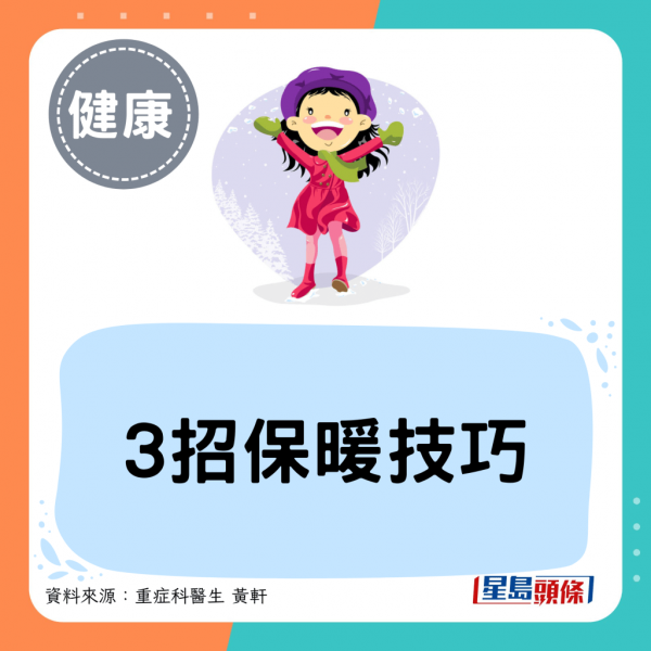 黃軒醫生表示,冬季真正該防範的從來不只是低溫,而是太悶、太乾、太少動,保暖的目的是讓身體更具能力面對寒冷。當為身體保留一些空氣流通、適度活動與自我調節的空間,感冒的機會會減少。因此,他也分享了3個冬季保暖的實用方法: