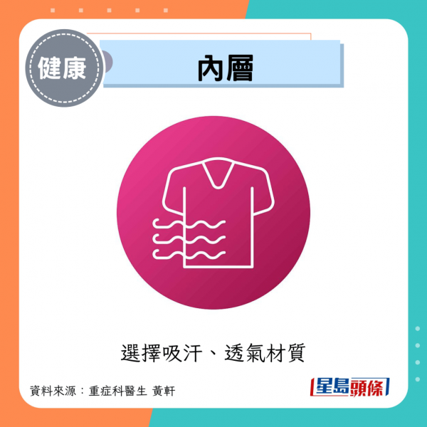 與其穿著一件厚重到難以活動的衣物,不如透過以下方式搭配,活動量大時可減少,靜止久坐則增添,以避免流汗後著涼: