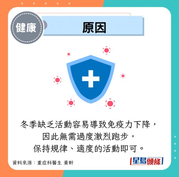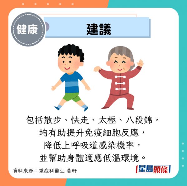 冬季缺乏活動容易導致免疫力下降,因此無需過度激烈跑步,保持規律、適度的活動即可,包括散步、快走、太極、八段錦,均有助提升免疫細胞反應,降低上呼吸道感染機率,並幫助身體適應低溫環境。