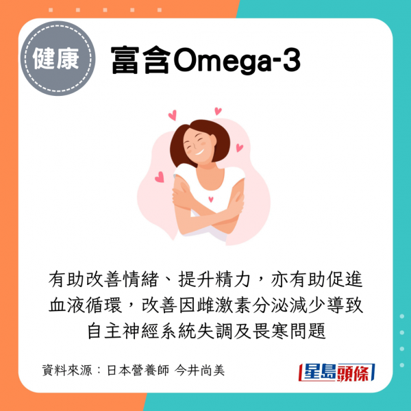 秋刀魚富含EPA和DHA。這些Omega-3脂肪酸有助改善情緒、提升精力,對於女性更年期經常出現情緒低落、煩躁、焦慮等狀況很有幫助。補充Omega-3亦有助促進血液循環,改善因雌激素分泌減少導致自主神經系統失調、畏寒的問題,同時維持新陳代謝,促進皮膚更新,對於抗衰老和減少脂肪積聚都有幫助。