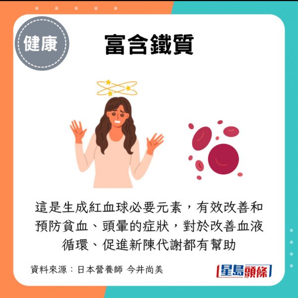 鰹魚除了Omega-3,也能提供豐富的鐵質和維他命B12。鐵質是生成紅血球必要元素,有效改善和預防貧血、頭暈的症狀。對於改善血液循環、促進新陳代謝都有幫助。至於維他命B12則有助活化能量代謝,緩解踏入更年期容易疲勞的問題。