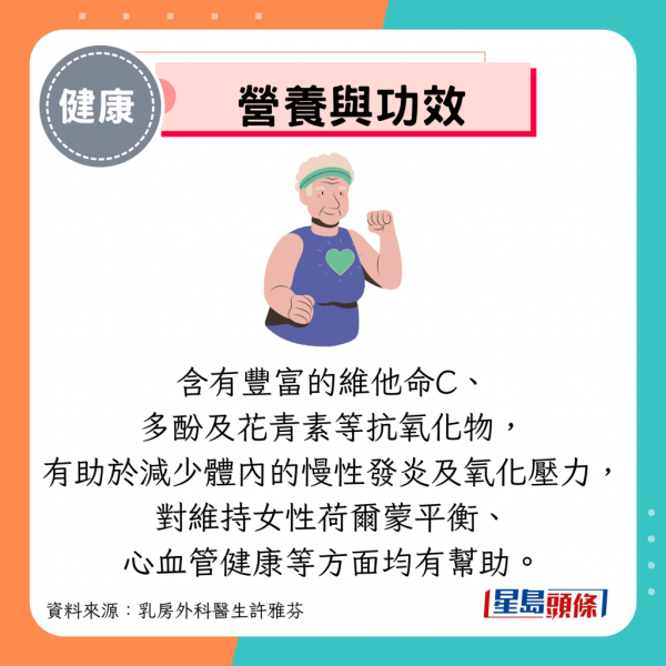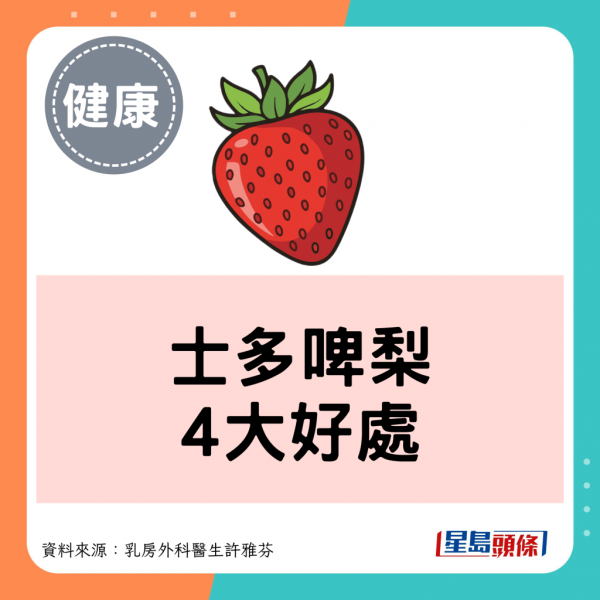 乳房外科醫生許雅芬Facebook專頁發文指,冬天是吃士多啤梨的季節,無論在本地超市,還是在日本旅行,總能看見士多啤梨及其製品。其實,士多啤梨不只美味,更含有豐富的營養素,對女性整體健康有正面影響,主要有以下4大好處: