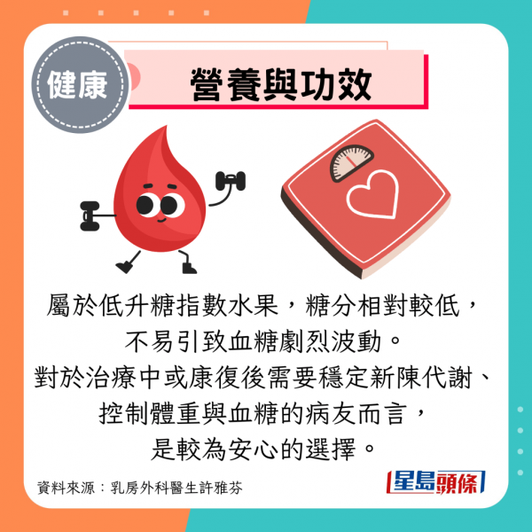 士多啤梨屬於低升糖指數(GI)水果,糖分相對較低,不易引致血糖劇烈波動。對於治療中或康復後需要穩定新陳代謝、控制體重與血糖的病友而言,是較為安心的選擇。