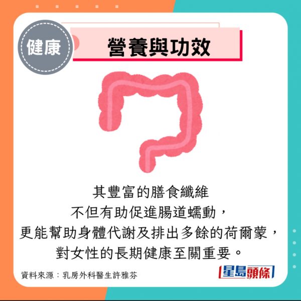 其豐富的膳食纖維不但有助促進腸道蠕動,更能幫助身體代謝及排出多餘的荷爾蒙,對女性的長期健康至關重要。