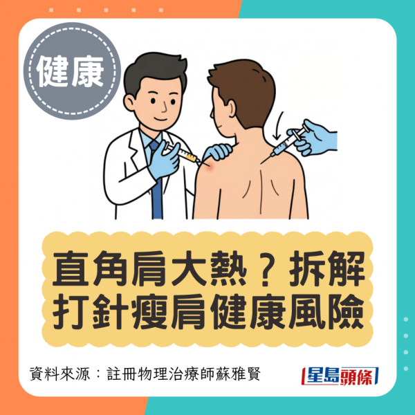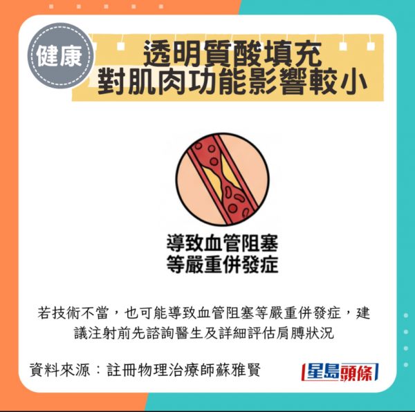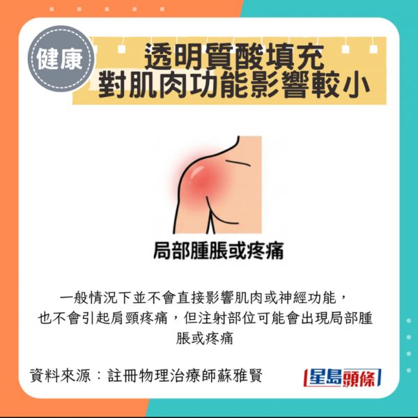 透明質酸主要用於增加肩膊輪廓的豐滿度,「透明質酸填充對功能的影響較小」蘇雅賢指出,這一般情況下並不會直接影響肌肉或神經功能,也不會引起肩頸疼痛。但她提醒,因為注射部位可能會出現局部腫脹或疼痛;若技術不當,也可能導致血管阻塞等嚴重併發症,建議注射前先諮詢醫生及詳細評估肩膊狀況。