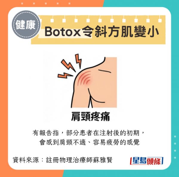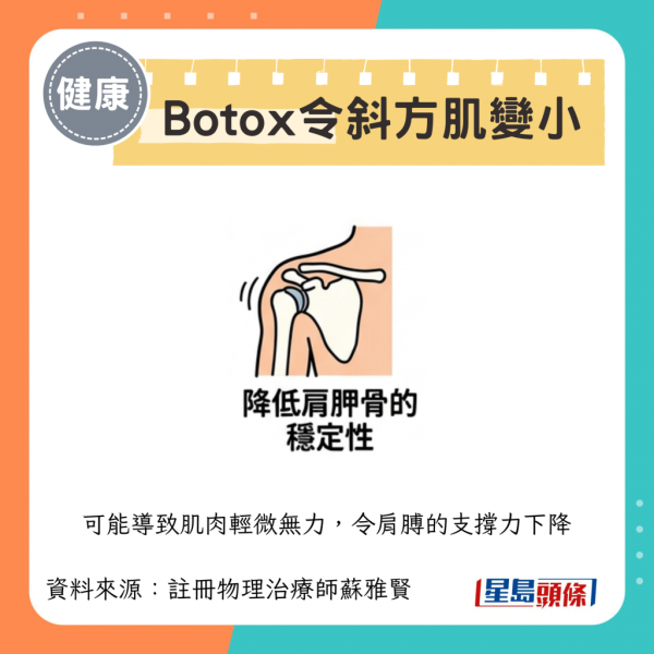 Botox如果由合資格人士作適量注射,一般不會造成嚴重功能障礙,但有機會影響斜方肌的動作協調,輕微影響肩胛骨的活動,蘇雅賢解釋:「如果長期或過量注射Botox,有機會導致斜方肌過度放鬆,直接削弱對肩胛骨的支撐力,不僅會降低肩胛骨的穩定性,更可能引發肩頸疼痛。」