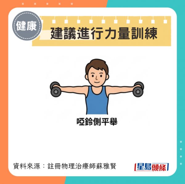 不少網上資訊教「每日X分鐘伸展練出直角肩」,到底有沒有用?蘇雅賢坦言:「簡單的伸展運動,是無法直接練出直角肩。」因為伸展主要用於放鬆繃緊的肩頸肌肉,以及提升關節的活動幅度,而非改變肌肉量及骨骼結構。想改變肩膊線條或增厚肌肉,她建議要進行力量訓練(或稱阻力訓練),重點訓練中上斜方肌、三角肌(尤其是中束)及肩袖肌群(即旋轉肌群),包括: