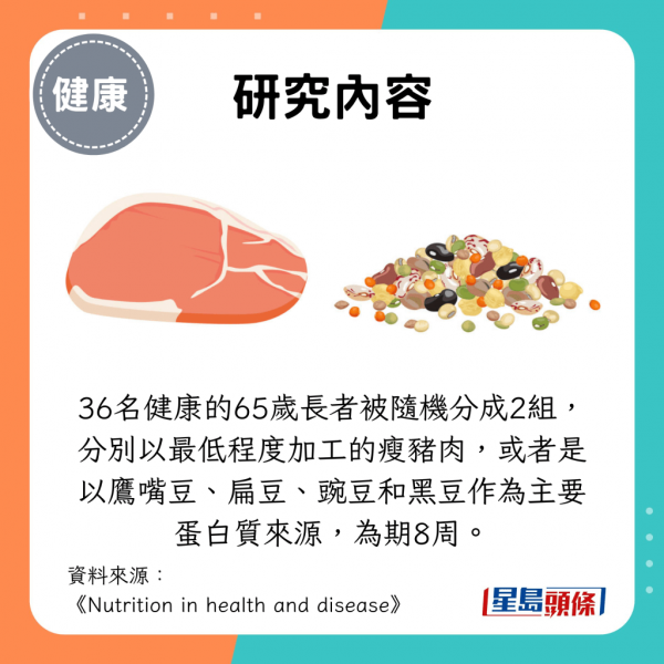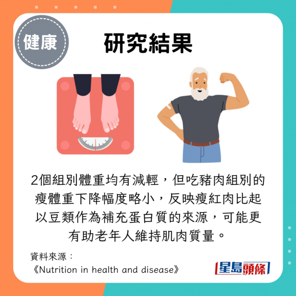 2個組別的長者的體重均有減輕,但食用豬肉組別的瘦體重下降幅度略小,反映吃豬肉等瘦紅肉,比起以豆類作為補充蛋白質的來源,可能更有助老年人維持肌肉質量。