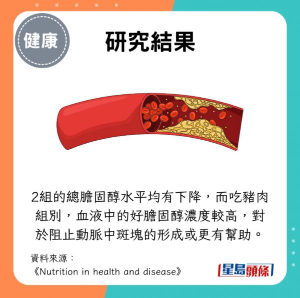 2個組別的總膽固醇水平也有所下降,對於降低心臟病和中風的風險有益。值得注意的是,豬肉飲食的參加者,血液中的高密度脂蛋白膽固醇(好膽固醇)濃度較高,對於阻止動脈中斑塊的形成可能更有幫助。