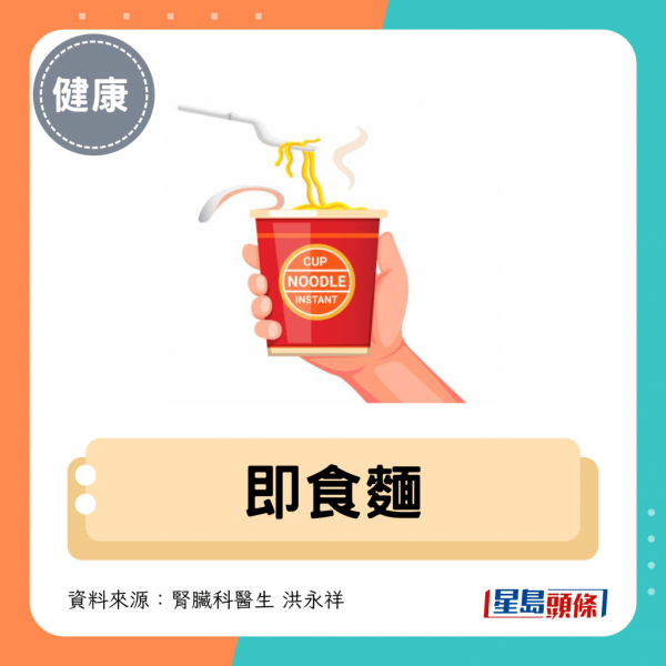 幾乎是每個人的宵夜充飢首選,但即食麵的調味包鈉含量極高,還可能含有磷酸鹽作為調味或防腐劑。經常食用不只令血壓上升,也讓腎臟長期過勞。