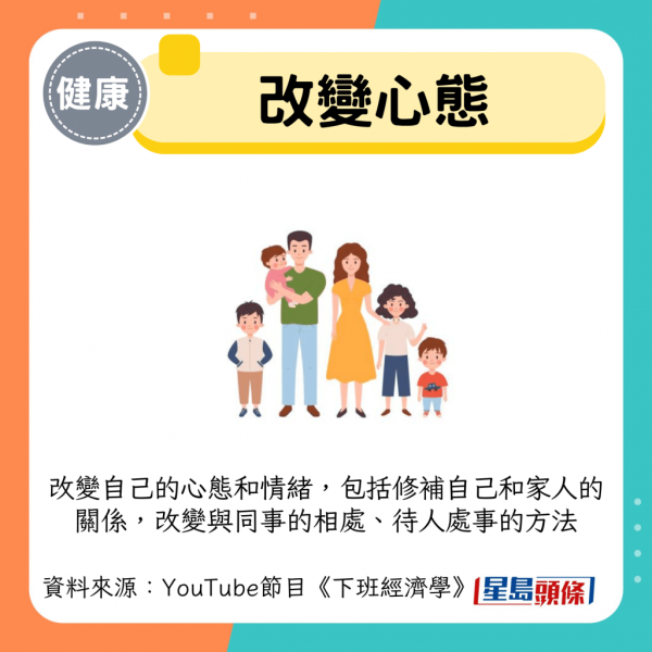 - 改變自己的心態和情緒,包括修補自己和家人的關係,改變與同事的相處、待人處事的方法;