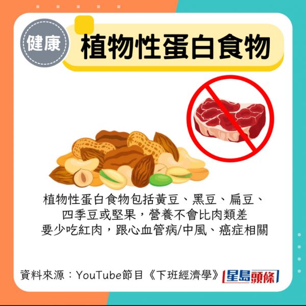 植物性蛋白食物包括黃豆、黑豆、扁豆、四季豆或堅果,營養不會比肉類差。許醫生提醒大家要少吃紅肉,因為多項研究都顯示,紅肉跟3大死因息息相關,包括心血管病/中風、癌症(尤其是大腸癌)和糖尿病。