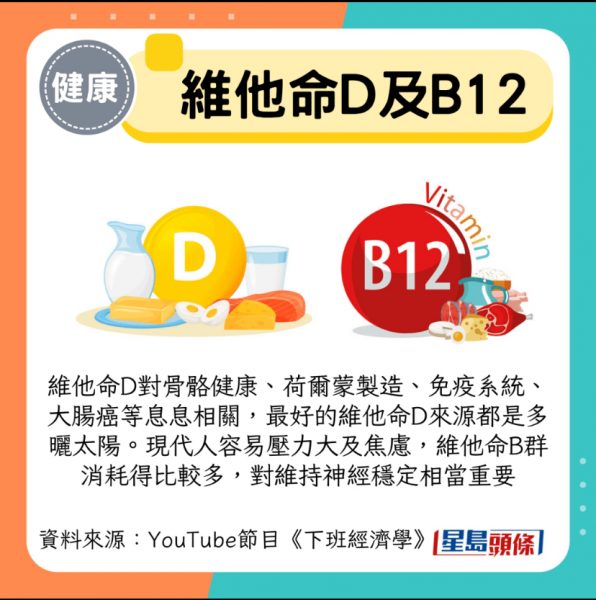 許醫生認為補充維他命D十分重要,因為維他命D對骨骼健康、荷爾蒙製造、免疫系統、大腸癌等息息相關,吃白肉或魚肉會吸收到維他命D,但最好的維他命D來源都是多曬太陽。現代人容易壓力大及焦慮,維他命B群消耗得比較多,B群對維持神經穩定相當重要。