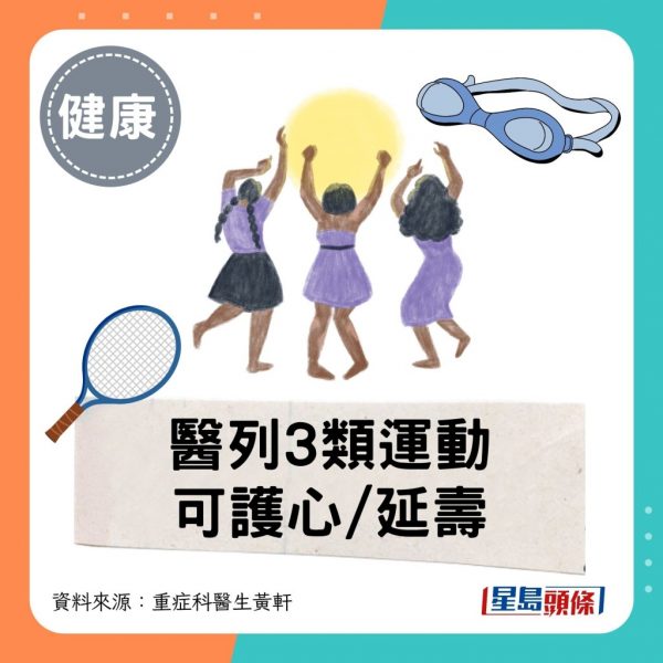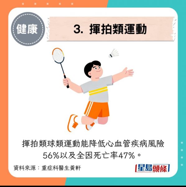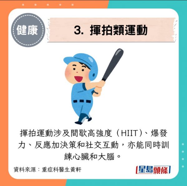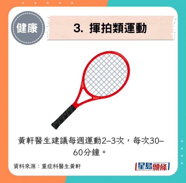 揮拍類球類運動能降低心血管疾病風險56%以及全因死亡率47%。揮拍運動涉及間歇高強度(HIIT)、爆發力、反應加決策和社交互動,亦能同時訓練心臟和大腦。黃軒醫生建議每周運動2–3次,每次30–60分鐘。