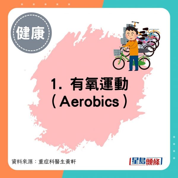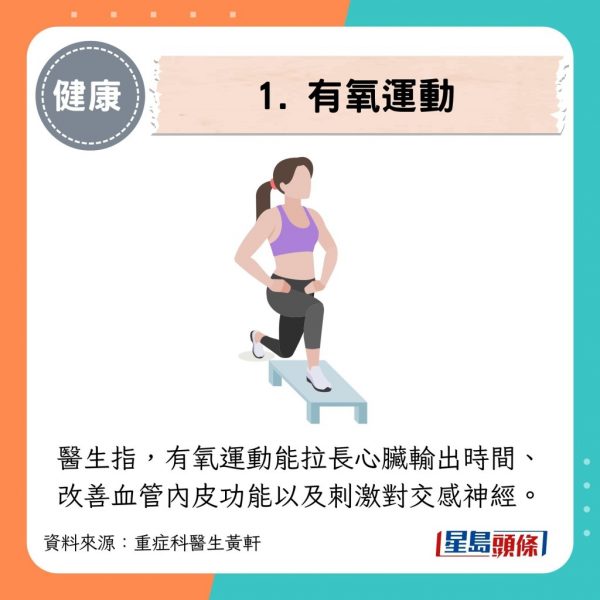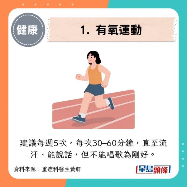 黃軒醫生指,有氧運動能拉長心臟輸出時間、改善血管內皮功能以及刺激對交感神經。建議每周做5次,每次做30–60分鐘,程度直至流汗,能說話,但不能唱歌為剛好。