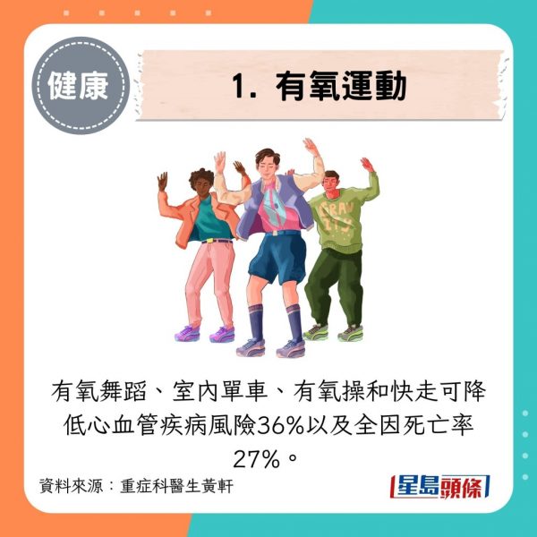 研究指,有節奏、有連續性、能維持心率的運動,例如有氧舞蹈、室內單車、有氧操和快走可降低心血管疾病風險36%以及全因死亡率27%。