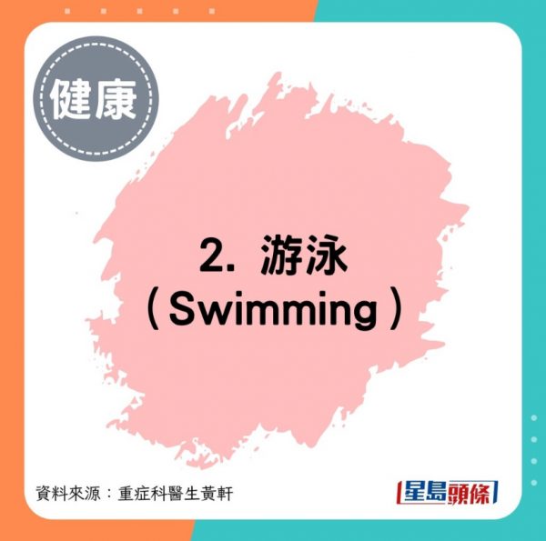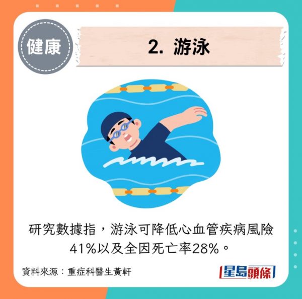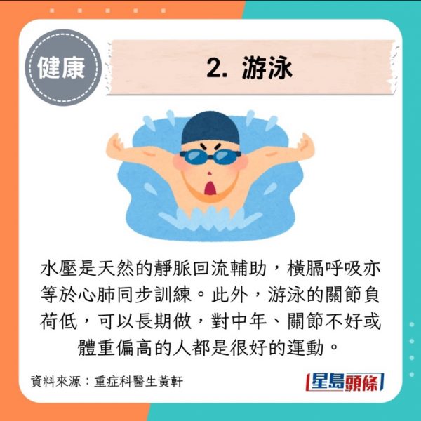 黃軒醫生指,水壓是天然的靜脈回流輔助,橫膈呼吸亦等於心肺同步訓練。此外,游泳的關節負荷低,可以長期做,對中年、關節不好或體重偏高的人都是很好的運動。黃軒醫生建議頻率為每周2–3次,每次30–45分鐘。
