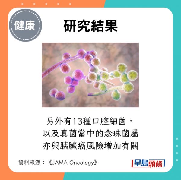 - 另外有13種口腔細菌,以及真菌當中的念珠菌屬亦與胰臟癌風險增加有關。