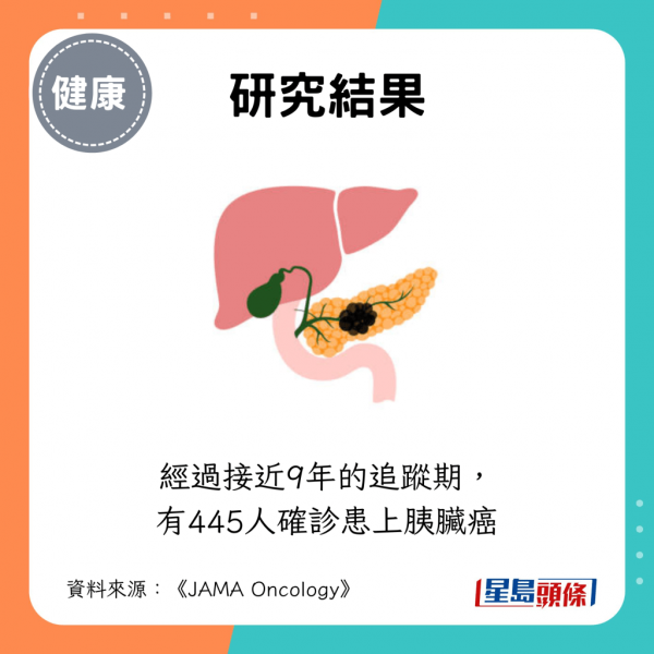 - 經過接近9年的追蹤期,有445人確診患上胰臟癌。