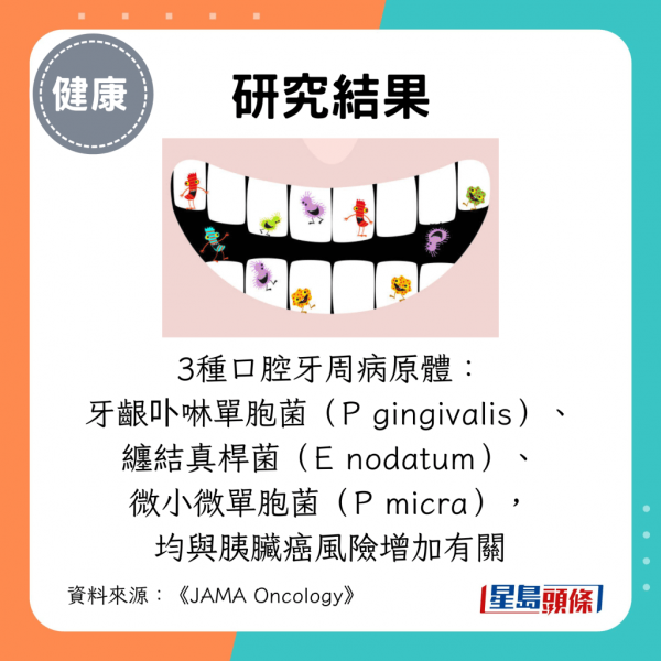 - 研究人員發現,3種口腔牙周病原體,包括牙齦卟啉單胞菌(P gingivalis)、纏結真桿菌(E nodatum)和微小微單胞菌(P micra),均與胰臟癌風險增加有關。