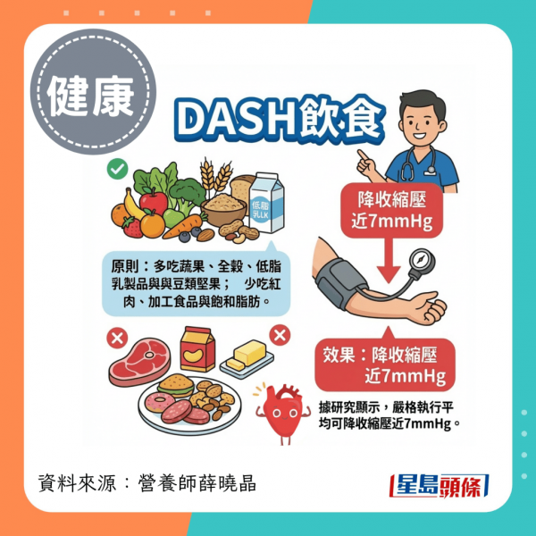 - 效果:據研究顯示,嚴格執行DASH飲食平均可降收縮壓近7mmHg。